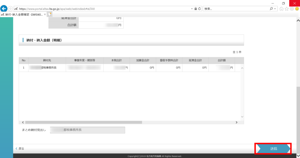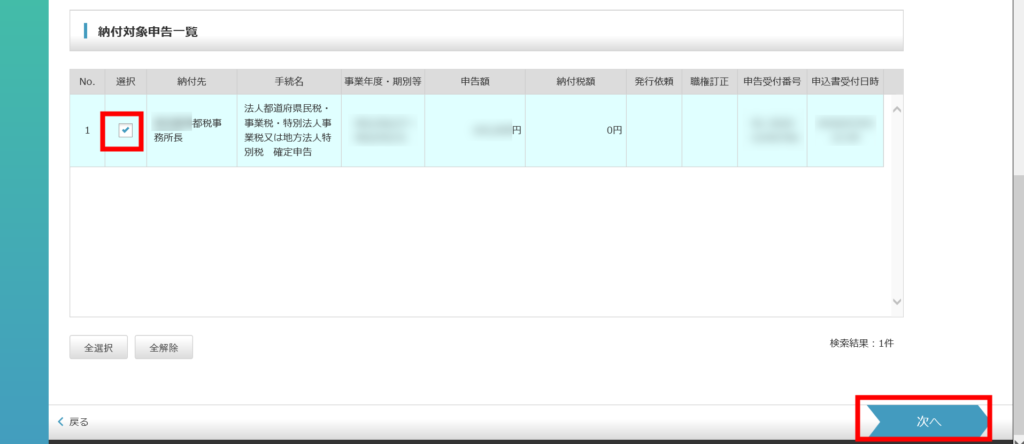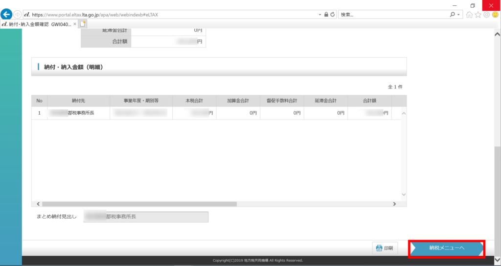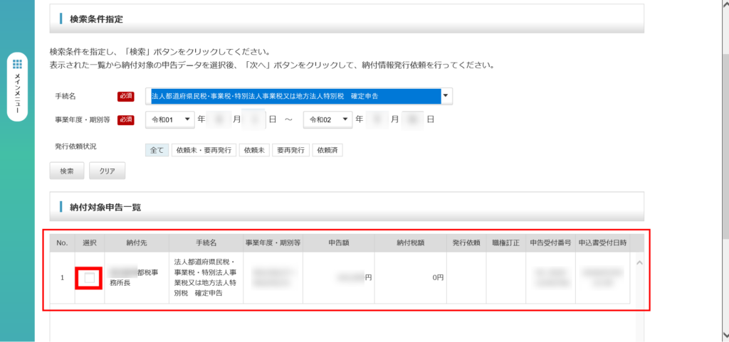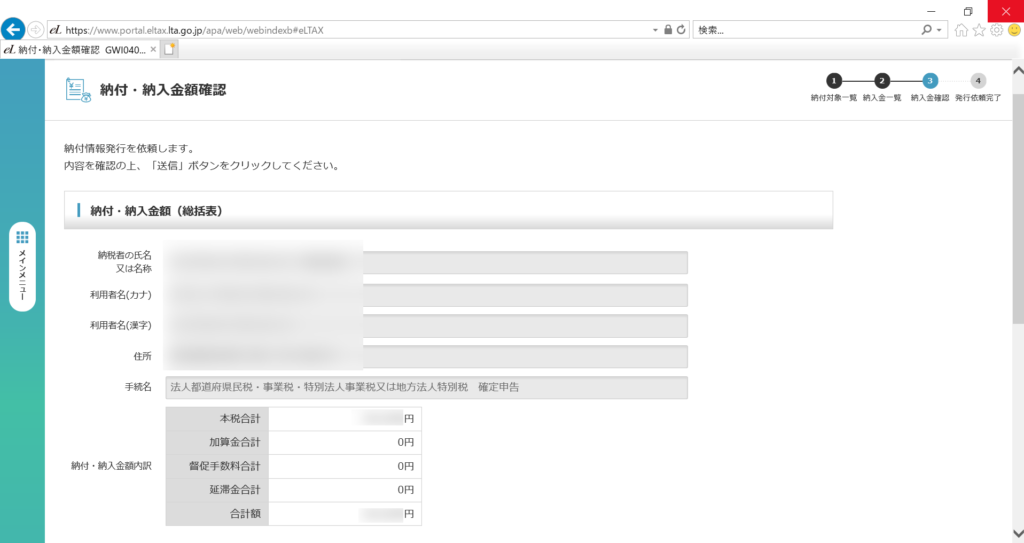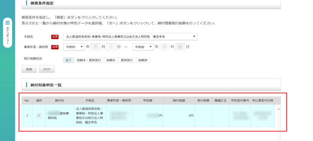 これで納付金額依頼が行われました。次は、納付金額依頼を確認し、ペイジーの納付番号等を取得します。