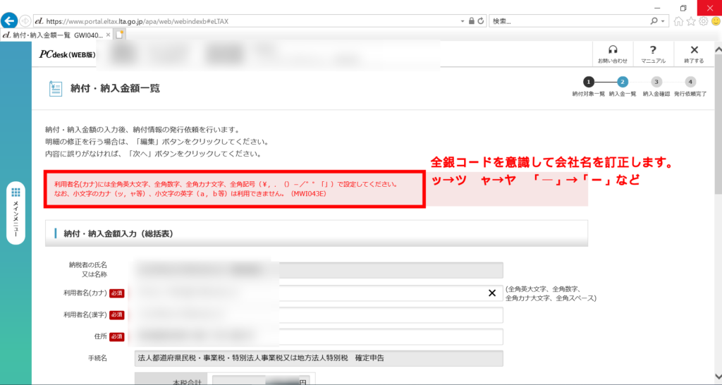 次の画面は、東京都に法人住民税(23区の場合)を納付する場合の例を示しています。