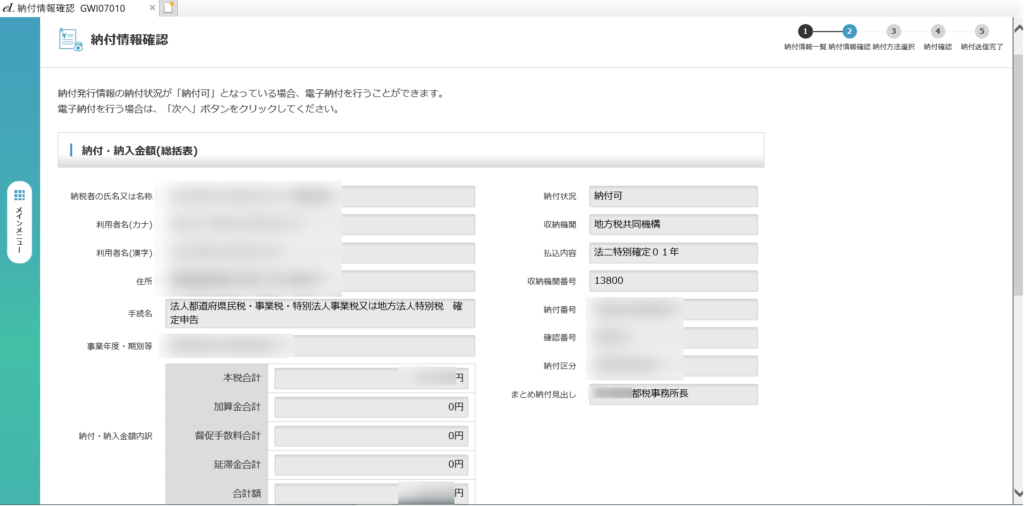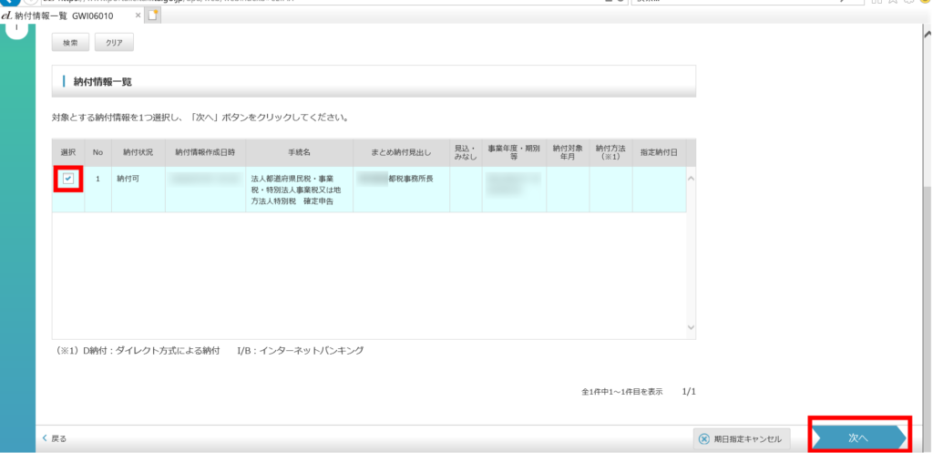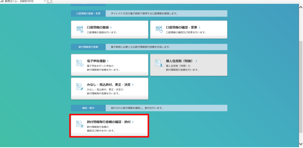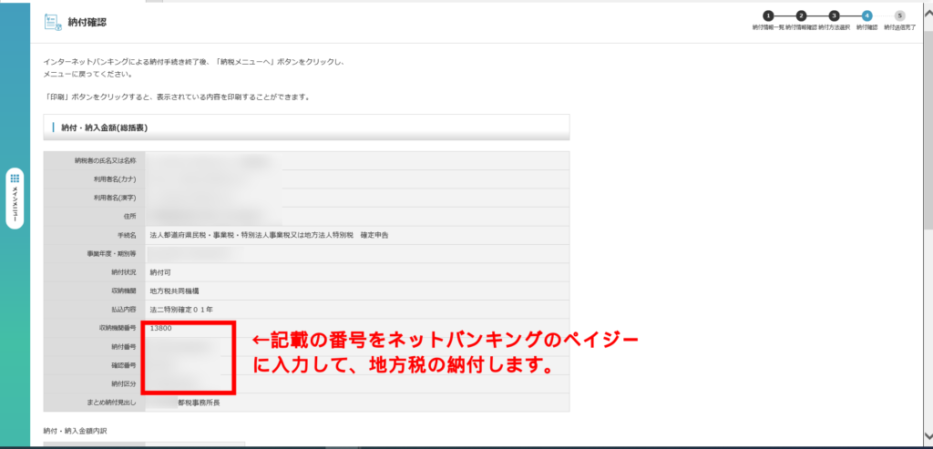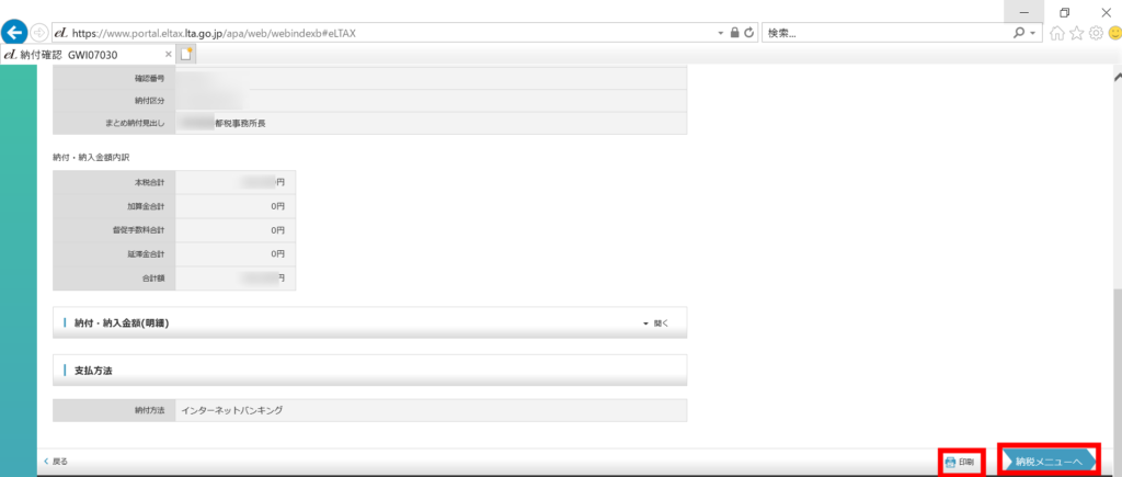 eL-taxによる地方税の納付(その2) 納付情報発行依頼の確認・納付 「印刷」を押下すると、納付情報番号等一式が印刷できますので、この情報をインターネットバンキングのペイジーに入力して納付を行います。 以上でeL-taxでの操作は終了です。ここから先は、ご利用のインターネットバンキングで納付作業を行ってください。