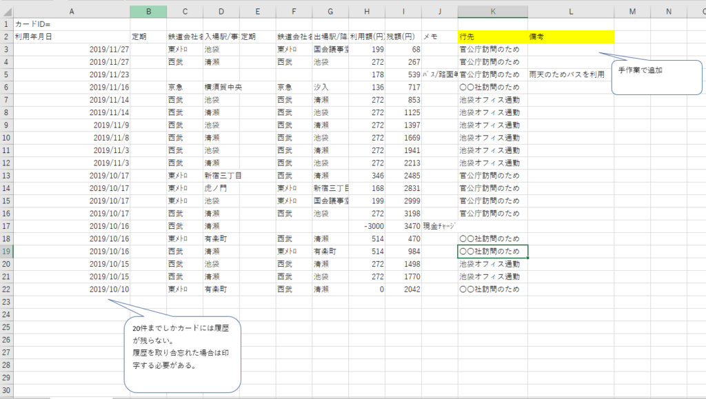 カードリーダーからダウンロードしたデータを少し加工して、行先もメモしておきましょう。このようにすることで仕事で使用した交通費であることが明らかになります。