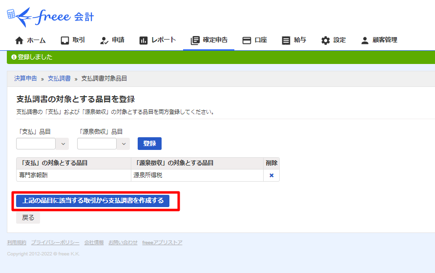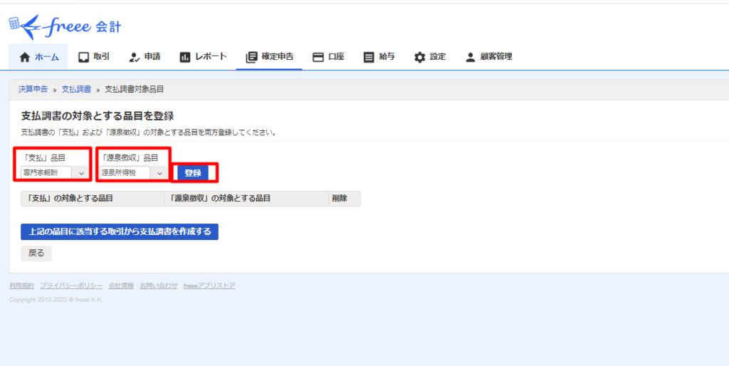 「支払」品目に「専門家報酬」、「源泉徴収」品目に「源泉所得税」を選択し「登録」を押下します。